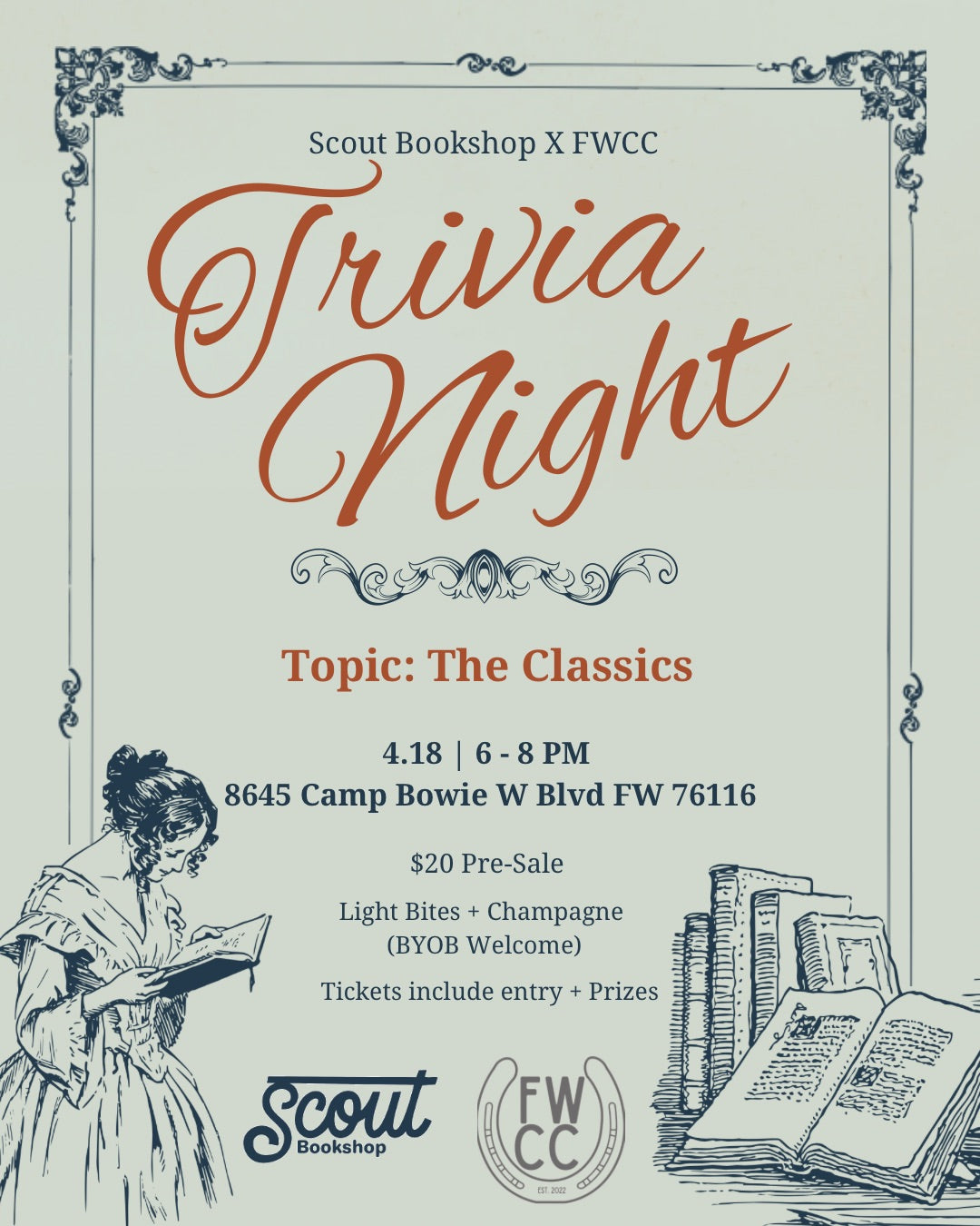 4/18 6-8 PM Grab your ticket!Come out to Cowtown Closet and test your classic literature knowledge. Win prizes from the closet like a purse, scarf + more!