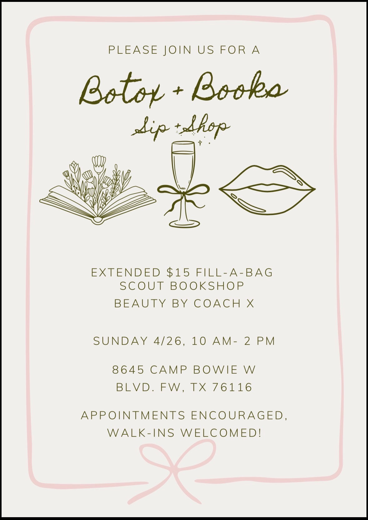 4/26 10-2 See you There!Spend your Sunday the right way with Cowtown Closet. Open 10-2 with botox services, Scout's Bookstore and a $15 Fill-A-Bag! Light bites and drinks provided!